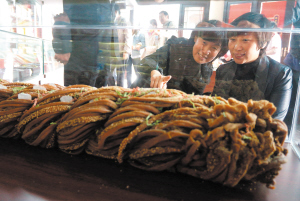 俗话说“民以食为天”,这沽酒巷旁的万国美食街果然成为古镇最火爆的巷子。阿拉伯烤肉传出的阵阵肉香、长沙臭豆腐散出的臭味儿、金黄色的蛋奶脆皮香蕉、淋着不同作料的铁板鱿鱼、圆润的章鱼小丸子、充满神秘感的西班牙拉丁果、清凉的刨冰、北塘的特色虾酱咸鱼……40个小吃摊子,诱惑着每一个游客。5元、10元、15元、20元……大家纷纷解囊尝鲜。一个个小吃摊子前都排起了长队,不过,也有几个摊子因原料有限,在12:00左右就将食品销售一空,不得不与热情的食客们说再见。