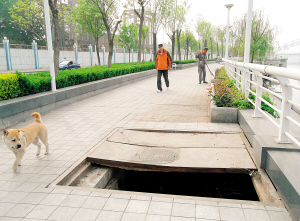 4月25日上午,记者在河东一侧位于直沽桥与大光明桥之间的海河岸边观光通道上找到了这口设施井。记者看到,这口井有1.5米见方,占了整个通道的一多半,由三块铁板作盖,由于有一块铁板不知何时丢失,在路面上留下一约1.5米长、0.5米宽的井口,里面有两根涂有蓝色油漆的管道被一些垃圾和树枝掩盖着,距井口约半米深。据王先生讲,他当时在海河边散步,一名40多岁的男子骑着自行车从后面超过去,没一会儿就听到“啊”的一声,那男子已跳下车,站在井边愣神呢。王先生走近一看,才知道刚才那人是差点掉进无盖井里。