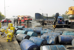 洒漏的液体不仅沿着路面流淌,同时还散发出刺鼻的异味,工作人员在赶紧查看了货物后,才知道车里拉载的是一些罐装的自喷漆,属于易燃易爆的危险品,而滚落在路边的50个蓝色塑料桶中,装的是乙二醇。于是一边救人,一边制订化学危险品的救援方案,在将车内的两人救出,交给了120急救人员后,消防调集的防化人员也赶来了现场,赶紧对洒漏的液体进行稀释。被送上了120急救车的两人来自山东,均不同程度受了轻伤,他们告诉交警,这辆农用货车拉了大概9吨物品。他们已被送到武警医院治疗。