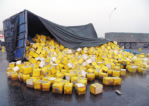 天津北方网讯:一辆来自山东的农用车真大胆,没有运载危险品许可证却拉了一车危险品,车辆限载2吨却拉了9吨。昨天凌晨4:00左右,这辆车在外环线与机场货运路交口处出了交通事故。相关的交管、消防、环保等8个部门都到现场参与救援,这才避免了事态的进一步发展。