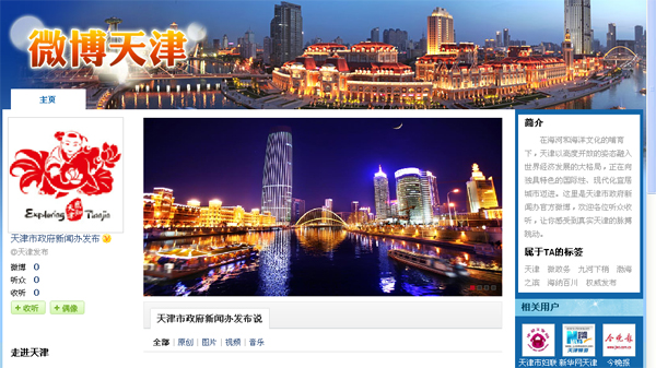 “天津市政府新闻办发布” (http://t.home.news.cn/tianjinxwb)作为天津市权威的政务微博平台,既承担着及时、准确、权威地发布天津市相关政策信息的责任,又是市委市政府与广大网友沟通互动的桥梁纽带。运用微博,政府可以更及时的了解民意,就民众关心的社会热点问题与广大网友互动交流,合力推进城市发展。