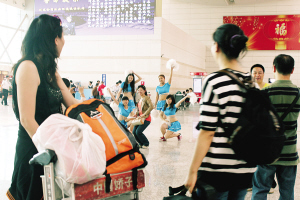 当天表演的4个女孩子都是大连工业大学一年级的学生,都是校舞蹈队的成员。一位旅客路过表演场地时问正在准备的舞蹈队员们:“你们是要跳舞给我们看吗?”女孩子们腼腆地笑着低下了头。