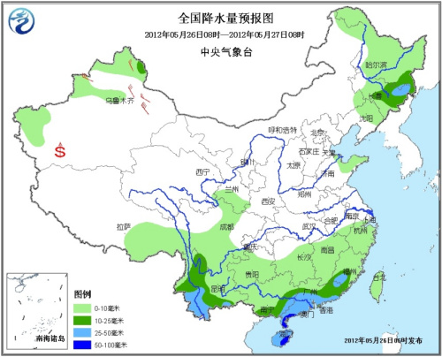 26日08时至27日08时,新疆西部和北部、东北地区大部、江南大部、华南、四川南部、贵州、云南等地有小到中雨或阵雨,其中,吉林东部、广东南部、广西东南部、海南、云南西南部等地的部分地区有大雨,局部地区有暴雨(50~80毫米);辽宁中东部和北部、吉林中东部和南部、山东南部、江苏北部、安徽北部、河南东部、河北北部及山西中部等地的部分地区将有雷暴大风或冰雹天气。新疆北部有4~6级偏北风。