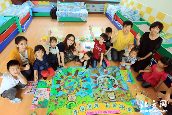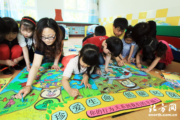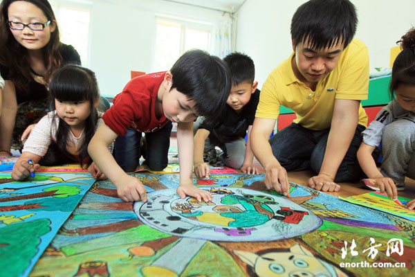 天津北方网讯:28日,北辰区小淀镇由大学生村官组成的志愿服务队与小淀镇第一中心幼儿园的孩子们一齐动手画画迎六一。6月5日是世界环保日,孩子们在大学生村官的协助下用手中的画笔绘制了精美的环保画,表达自己对环境保护的美好心愿,让这个儿童节更有意义。(通讯员于晨曦)