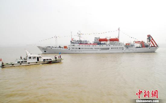 | 6月3日上午,“向阳红09”试验母船搭载蛟龙号载人潜水器从无锡江阴苏南国际码头起航,奔赴马里亚纳海沟区域执行蛟龙号载人潜水器7000米级海试任务,挑战中国载人深潜历史的新纪录。中国是继美、法、俄、日之后世界上第五个掌握大深度载人深潜技术的国家。中新社发 澄海宣 摄 |