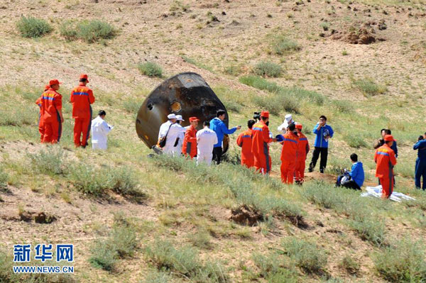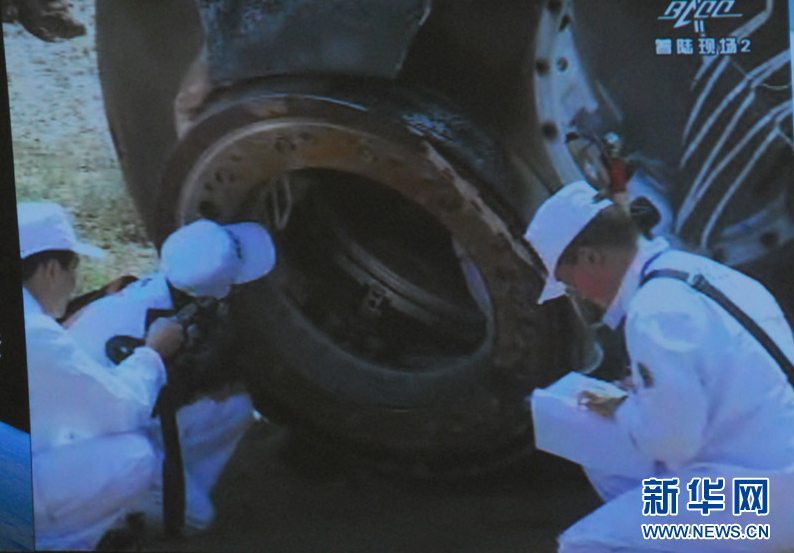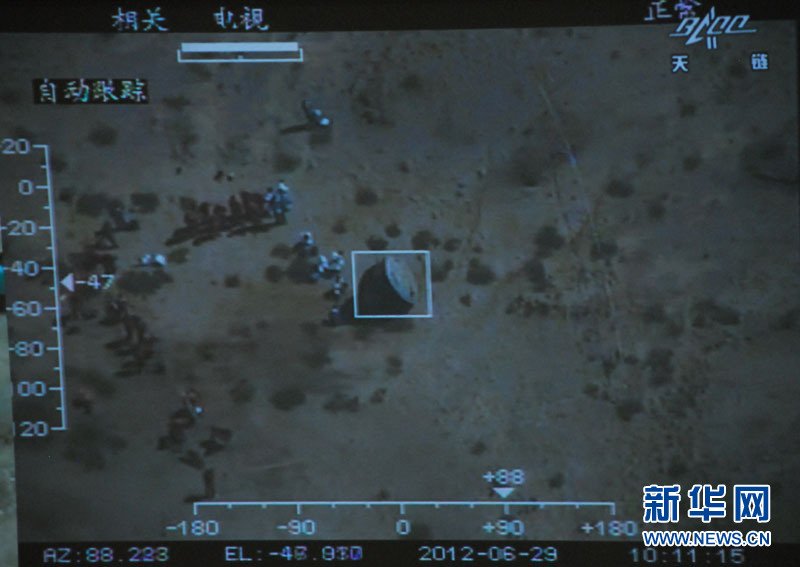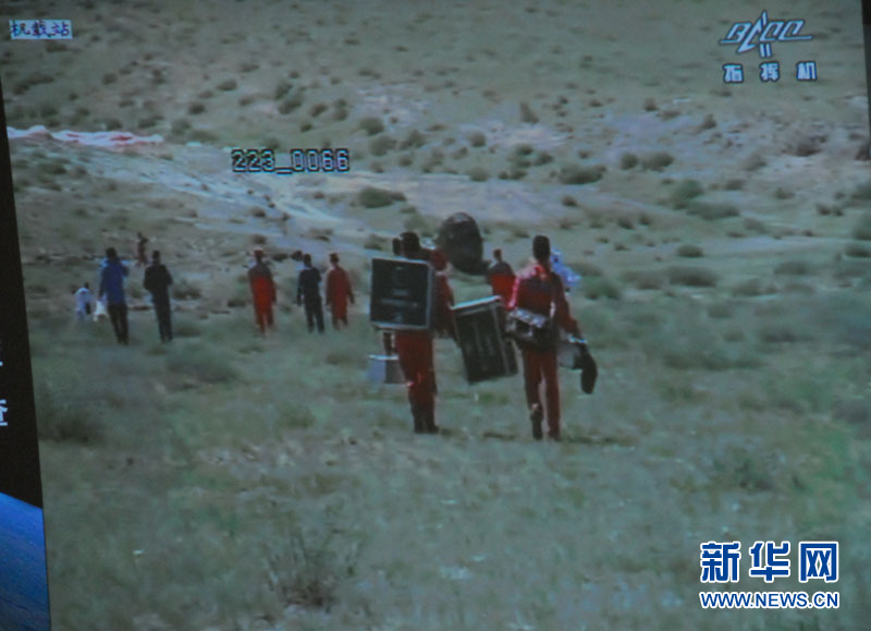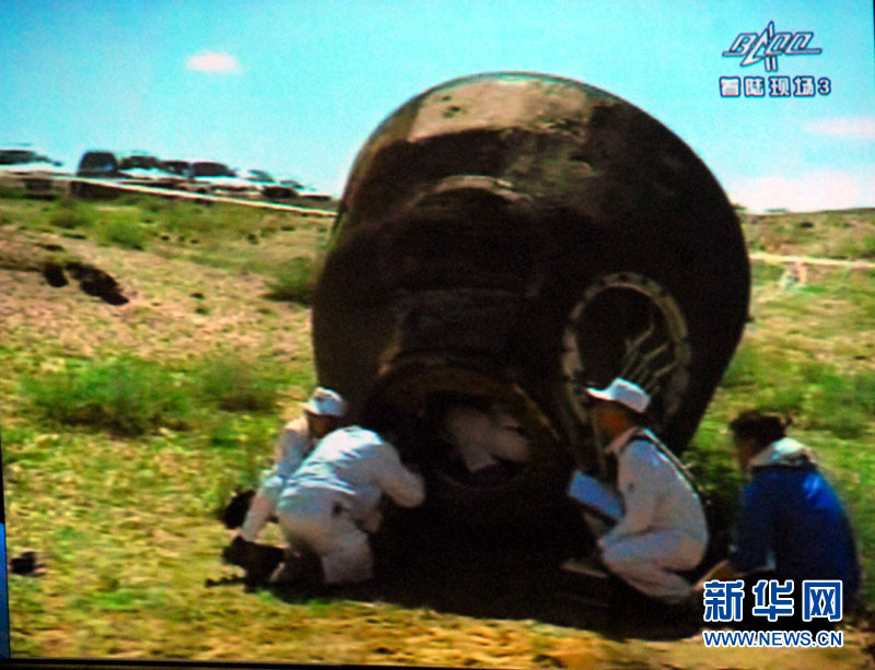 | 本月16日发射升空的神舟九号飞船,在完成各项任务后,于今日踏上归途。图为工作人员正在打开返回舱。(视频截图) |