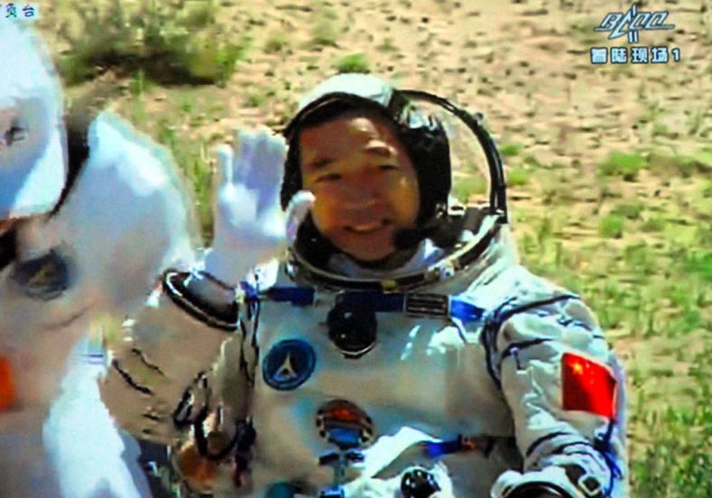 | 本月16日发射升空的神舟九号飞船,在完成各项任务后,于今日踏上归途。图为航天员刘旺出舱。(视频截图) |