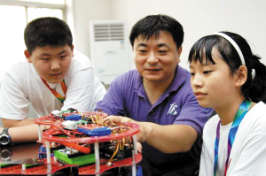 夏瑞:机器人的性能决定比赛的成败,对小选手来说,首先要具备很强的逻辑思维能力。因为机器的运行需要编程来控制,所以编程的能力必须超常。此外,想象力和较强的动手能力也很重要,因为在创意大赛中,只有善于创新的孩子才能发挥实力,动手能力考验的是孩子们组装机器并且不断进行调试的能力,这点对于机器人在场上的灵活操作是很重要的。在选手中,男女学生的比例几乎是各占一半的,有时候女孩子的能力甚至比男孩子还强,女孩子很善于操作。