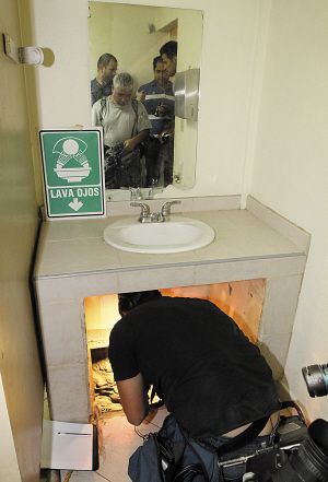 7月12日,在墨西哥边境城市蒂华纳一工业区的回收厂,媒体记者等待拍摄地下通道入口。