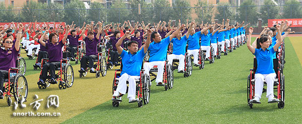天津北方网讯:8月6日上午,天津市第三届“体彩杯”全民健身运动会暨第二届“残疾人健身周”活动轮椅广播健身操展示与比赛在市残疾人文艺体育训练指导中心举行,来自全市16个区县近500名肢体残疾人参加了此次轮椅广播操展示与比赛。