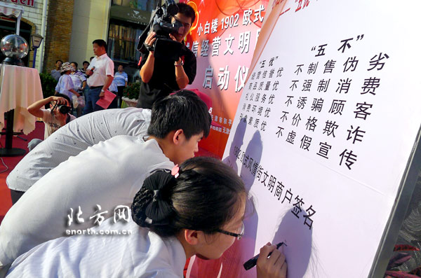 1902欧式风情街各商铺负责人来到启动仪式现场,在“小白楼1902诚信经营文明服务承诺”板上签名自律,承诺做到“五不”:不制售伪劣、不强制消费、不诱骗顾客、不价格欺诈、不虚假宣传;“五优”:经营信誉优、商品质量优、礼仪服务优、消费环境优、形象素质优。