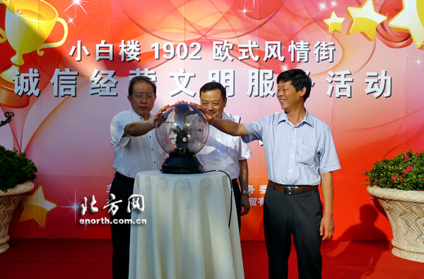 天津北方网讯:8月9日下午,由天津市和平区商务委员会主办、华旭集团华士林商贸有限公司承办的“小白楼1902诚信经营文明服务活动”在小白楼1902欧式风情街隆重启动,鼓励引导全区商业企业加强职业道德建设,树立行业文明新风,叫响“最好的服务在和平”。