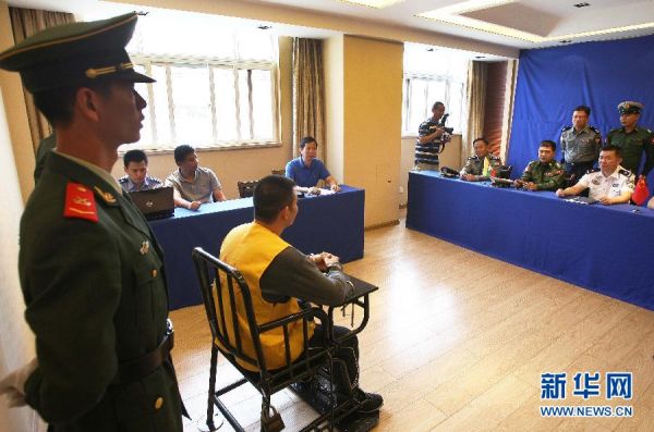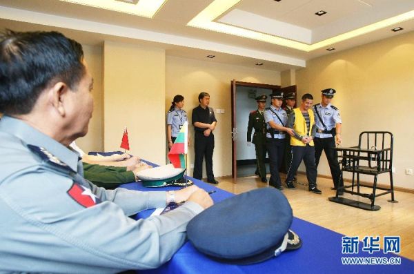 | 8月22日,以缅甸国防军总司令部军事情报部少数民族武装事务处处长左奈吴中校为组长的军警联合工作组,在昆明提审“金三角”特大武装贩毒集团及“10·5”案件主犯糯康等犯罪嫌疑人,并与中方交流通报“10·5”案件工作进展情况。新华社发(李方宇 摄)图片来源:新华网 |