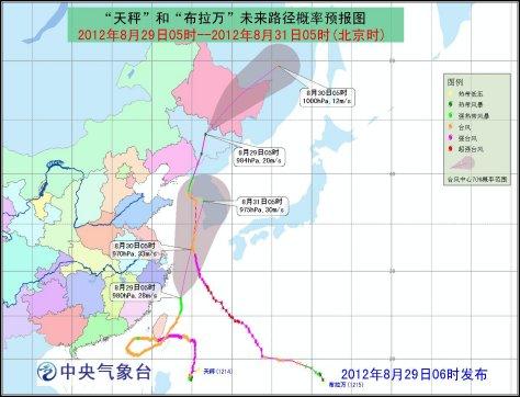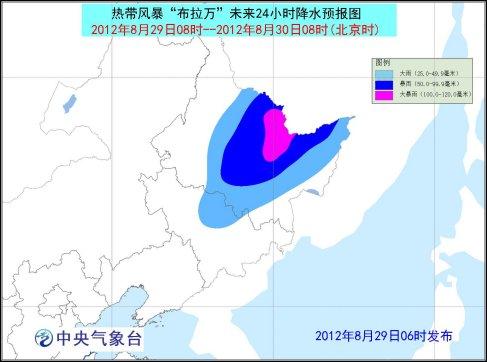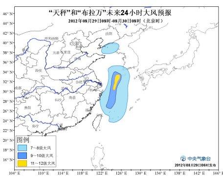 受“布拉万”和“天秤”影响,29日08时到30日08时,黄海南部、东海大部、台湾东北洋面将7-9级大风,部分海域阵风有10-11级,“天秤”中心经过的附近海域风力可达10-12级,阵风可达13-14级;辽宁沿海、黄海北部、浙江沿海也将有6-7级大风,阵风8级;受“布拉万”和冷空气共同影响,吉林中部偏北、黑龙江中东部等地有大到暴雨,其中,黑龙江中部偏北等地的部分地区有大暴雨(100~120毫米)。