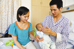 昨日中午,记者走进一中心医院器官移植大楼7楼病房时,刚刚睡醒的黄荣隆正在父亲黄庆尧的陪伴下玩耍。见到记者前来,他顿时睁圆了大大的眼睛,好奇地看着我们。“儿子现在9个多月大,恢复得不错,最近一直想爬,考虑到他肚子上的伤口,还不行。”黄庆尧说。记者看到,与手术前相比,小荣隆原先肿胀的肚子恢复了不少。暗黄的皮肤红润了许多。“孩子从生下来皮肤便发黄,后来变得暗黄,我从来没见他这么白过。”小荣隆的母亲赖姗姗脸上露出了欣慰的笑容,“更主要的是,经过手术,他的性格变得越来越活泼了。手术前,他坐立不到5分钟便会哭泣,现在吃过饭,能坐着玩一小时以上,与爸爸的交流也多了。”