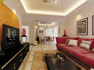 设计:此户型整体设计规整,布局合理,面积适中。南北通透,有利于空气流通。从入户门开始有一条较长的过道。视野宽广。主卧带有独立卫生间。客厅处有一个休闲阳台,餐厅处也有一个生活阳台。设计风格为简欧风格,整体基调统一,枚红色的沙发和餐椅彰显贵族气息,电视柜造型优美,颜色搭配与茶几相符。大面积墙纸的使用,增加温馨的感觉。餐厅与厨房相连,方便快捷。两个卧室面积相当,暖黄色调给人家的感觉。