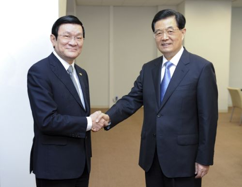 国家主席胡锦涛7日在俄罗斯符拉迪沃斯托克会见越南国家主席张晋创,就巩固和发展中越关系坦诚深入交换意见。