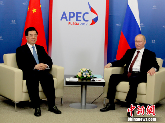 在亚太经合组织(APEC)第二十次领导人非正式会议召开前夕,中国国家主席胡锦涛当地时间7日下午在俄罗斯符拉迪沃斯托克会见俄罗斯总统普京。这是中俄两国元首时隔近三个月再次举行会晤。