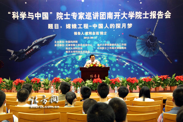 天津北方网讯:9月17日下午,“科学与中国”院士专家巡讲团南开大学院士报告会在省身楼报告厅举行,被誉为“嫦娥之父”的中国科学院欧阳自远院士为南开师生带来了题为“嫦娥工程--中国人的探月梦”的主题报告,副校长杨克欣出席报告会并进行了简短致辞。