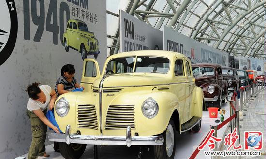 展会工作人员擦拭老爷车为展出做最后准备。渤海早报记者兰飞摄