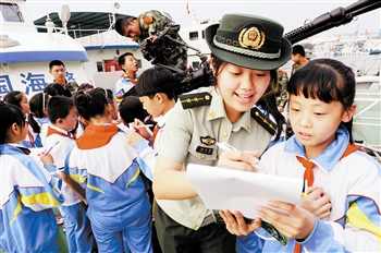 9月20日,一名海警在为同学讲解大陆架及岛屿的地理知识。当日,青岛包头路小学同学们来到山东海警二支队国防教育课外基地,开展“识海图知海岛爱海疆”主题教育活动,普及、补充大陆架及岛屿地理知识,认知祖国辽阔、富饶的海疆,从小培养同学们的爱国情怀。新华社记者李紫恒摄