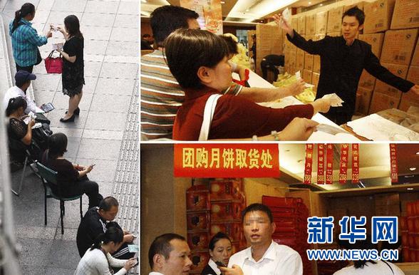 左图:在上海徐家汇街头回收月饼券的“黄牛”排成行;右上:市民在上海一家月饼厂商的门店内凭券提货;右下:在网络上团购月饼券的市民在厂商的门店内排队等候取货(9月23日摄,拼版照片)。