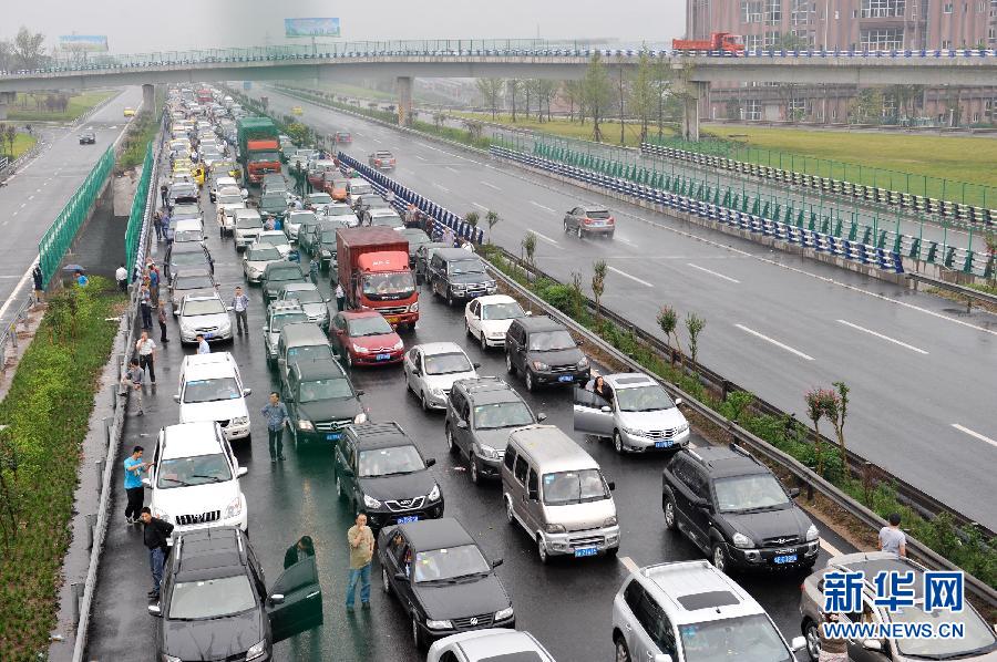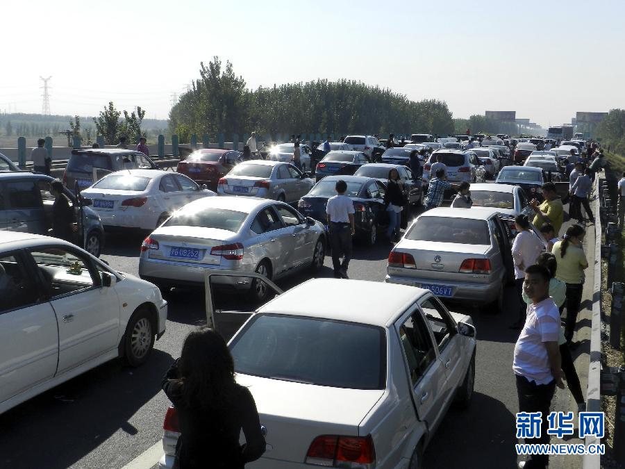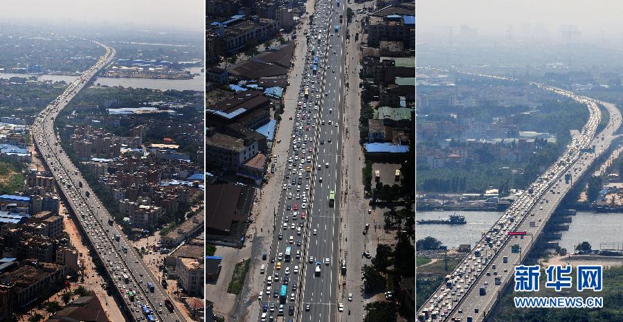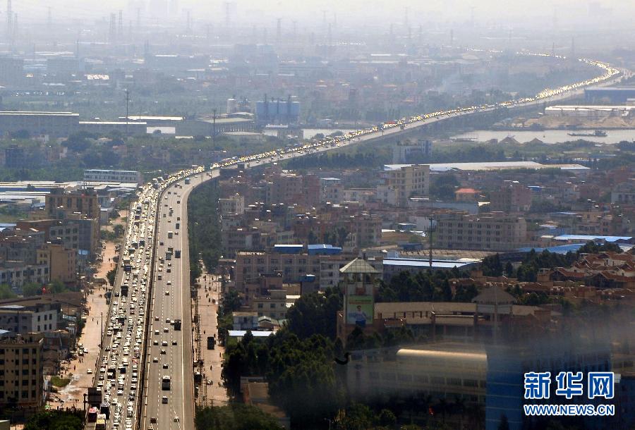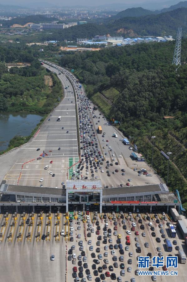 9月30日,京珠高速广州太和收费站处汽车排起了长龙。今年中秋国庆是施行道路免费通行政策后的首个长假,据预测,高速公路车流量将同比增长四至八成。当日,记者航拍京珠高速、广深高速等主要干道发现,广东省内各主要干道多数都出现塞车现象,特别是京珠高速鳌头至太和、广深高速福永至虎门、广深高速道滘至火村段都出现了20到30公里的车龙,而惠(州)河(源)高速平南至泰美段更是出现了长达40公里的车龙。