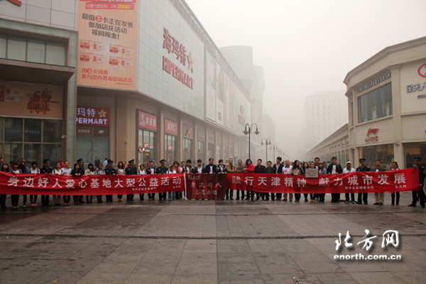 天津北方网讯:10月27日上午,北方网“身边好人志愿者团”爱心基地在和平区滨江道举行揭牌仪式,这是北方网继鹤寿养老院、圆梦家园、太阳村、鹤童老人护理院之后,建立的第5个爱心基地。同时,和平区繁华办也接过北方网身边好人爱心接力的第53棒。仪式后,来自北方论坛身边好人志愿者团的近百名网友参加了“践行天津精神,献力城市发展”为主题的大型公益环保活动。
