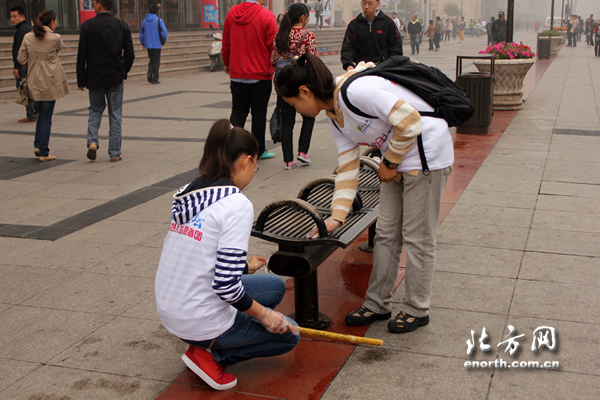 来自天津机场消防救护支队的几名北方论坛网友最为辛苦,他们不仅在自己的宣传点位附近清理口香糖、烟蒂等垃圾,还去协助其他宣传点清理垃圾。除了活动地点外,他们还走进滨江道周边的胡同,仔细清理地上的垃圾,每一个细小的地方都不放过。来自师范大学的几名北方论坛网友也是当仁不让,工具无法解决的地方,姑娘们就用手捡。此外,她们还把路边的椅子和垃圾桶都擦拭干净,更是在道路中间的花坛中仔细搜寻垃圾,不放过所有的角落,不怕脏不怕累的精神得到了周围过往市民的赞许。