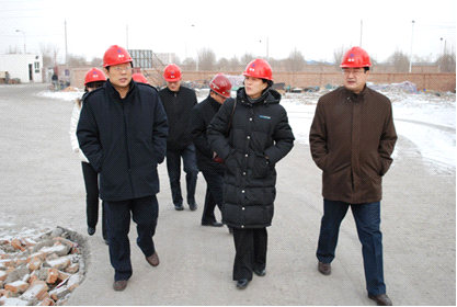 国务院援疆干部姜力(前排居中)视察援疆基础建设项目工程推进情况。