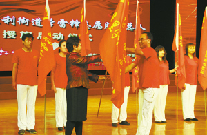 天津北方网讯:滨海新区胜利街道学雷锋志愿服务总队授旗仪式近日在大港大剧院举行。大港管委会领导和胜利街工委领导分别为胜利街学雷锋志愿服务总队、社区学雷锋志愿服务队授旗。目前大港胜利街有4000余名志愿者服务在5000余个岗位上,广泛参与社区文明创建、卫生清理、双拥助残、扶贫助困等活动,为建设和谐和睦的社区环境发挥了重大作用。图为大港胜利街学雷锋志愿服务总队授旗仪式现场。本报记者兰飞摄 通讯员袁玮