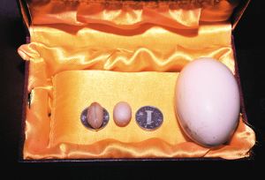 昨日上午,记者来到了位于河西区珠海里的邢大爷家,大爷小心翼翼地拿出一个原本盛放珠宝的锦盒,展示这枚袖珍鸡蛋。“蛋太小了,生怕磕着碰着。”打开锦盒后,一枚椭圆形的超小鸡蛋呈现在眼前,不过蛋壳比较粗糙,上面有一些小疙瘩。记者拿出一枚一角钱硬币,这枚袖珍鸡蛋竟然能在上面打滚,跟一颗果仁一般大。之后,邢大爷拿出同一只鸡产下的鸡蛋进行对比,记者发现除了两枚要小一些外,其他鸡蛋都很大。用卡尺测量,这枚超级袖珍蛋只有1.7厘米长。