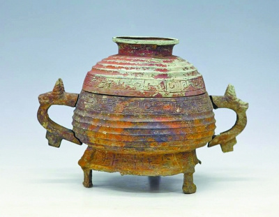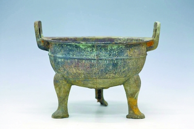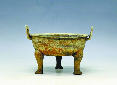 | 青铜鼎,敞口,浅腹,底近平,二长方形附耳(附耳内残留范铸红陶土),三素面蹄足。口沿下饰一周夔龙纹,夔龙纹下一周凸弦纹,腹部素面,有铭文。时代属春秋早期,为一级文物。 |