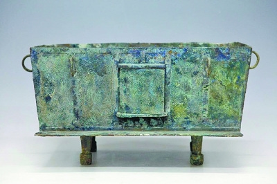 | 青铜方形炉,长方形,平底,四蹄足,长边有门的一侧出沿,沿上与门对应的方向有二个小穿孔,口沿部分有一圈宽弦纹,门可开启,二长边各有二个圆形环,二短边各有一个圆形环,二个长方形面各饰有二对凤鸟纹,二个短面各有二个凤鸟纹,门上有二个凤鸟纹,地纹均为珍珠地,纹饰为阴线刻。时代属汉代,为一级文物。 |