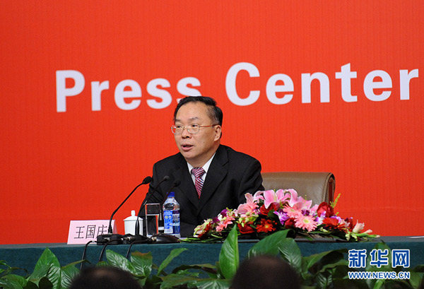 2012年11月9日,中国共产党第十八次全国代表大会举行第二场记者招待会,请国家发展和改革委员会主任、党组书记张平介绍中国经济和社会发展情况,并回答记者提问。图为记者招待会由王国庆主持。新华网陈竞超摄