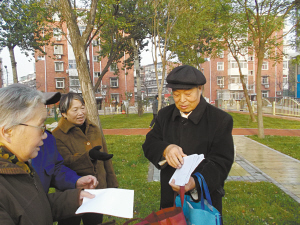 | 张仲年(右一)正在发放“健康宝典”。记者 曲彤 摄 |