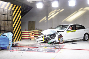 在此次实车碰撞试验展示中,中汽中心安排了宝马新3系进行正面40%碰撞试验。该试验按照C-NCAP 2012年版管理规则实施,碰撞速度由2006年版管理规则的56km/h提升至64km/h,对结构耐撞性的要求进一步提高,对车型的安全设计有更高要求。