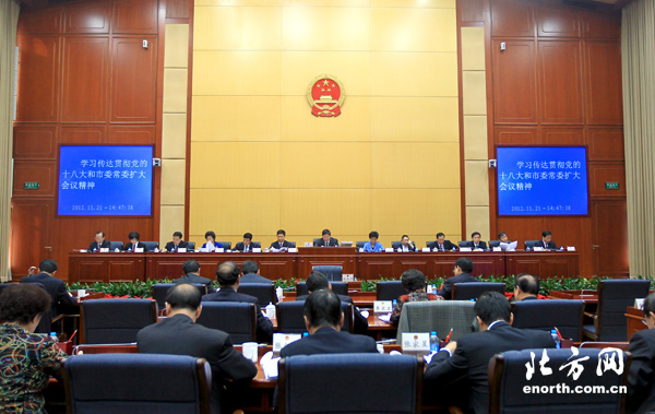 天津北方网讯:21日下午,天津市十五届人大常委会举行第三十六次会议,认真传达学习贯彻中国共产党第十八次全国代表大会和市委常委扩大会议、全市领导干部会议精神。市人大常委会主任肖怀远主持会议并讲话。市人大常委会副主任史莲喜、苟利军、张元龙、邢明军、李亚力、李润兰、王宝弟、李泉山和秘书长王世新出席会议。副市长尹海林,市人民检察院检察长于世平,市高级人民法院负责同志,市人大各专门委员会主任委员、副主任委员,市人大常委会各工作部门、市政府有关部门和各区县人大常委会负责同志,部分市人大代表列席会议。