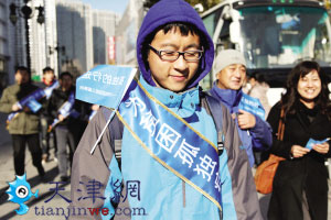 昨天上午11:00,窦一欣、陈萌及天津财经大学的志愿者和天津市一些自闭症孩子以及家长来到百盛广场前,胸前佩戴上写有“孤独的行走关爱自闭症”的蓝丝带后,一行人徒步沿滨江道行走。窦一欣和陈萌走在队伍最前列,他们一边行走,一边向路人分发印有自闭症孩子绘画的明信片,并不时向路人讲解有关自闭症的相关知识。