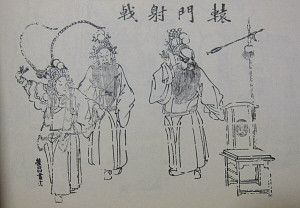 辕门射戟,最早出自《三国志·吕布传》,讲的是吕布为了阻止袁术击灭刘备所使的计谋,后来罗贯中将这个典故改编为脍炙人口的“吕奉先射戟辕门”。杨柳青年画《辕门射戟》描绘的就是这个故事。画作以京剧戏出为样本,画中吕布、刘备、纪灵,神情生动,实为杨柳青年画中的佳作。