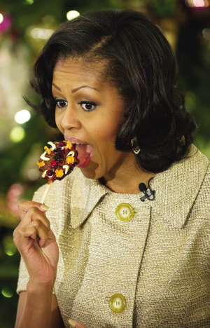 11月28日,美国第一夫人米歇尔·奥巴马品尝和孩子们一起做的棒棒糖。