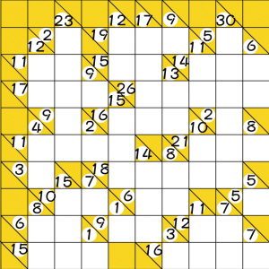 游戏规则:将数字1至9填入白色空格中,方格中斜线上方的数字为该数字右面对应的一组水平连续白色空格里的数字之和,斜线下方的数字为该数字下面对应的一组垂直连续白色空格里的数字之和,同一数字在每组水平或垂直空格里只能出现一次。