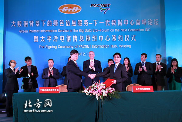 天津北方网讯:12月5日,“大数据背景下的绿色信息服务——下一代数据中心高峰论坛暨太平洋电信信息枢纽中心签约仪式”在天津武清开发区天狮健康产业园举行。国家工信部、天津市经信委、国内外电信企业专家参加了论坛。论坛结束后,武清商务区总公司与太平洋电信集团签署了建设电信信息枢纽中心协议。