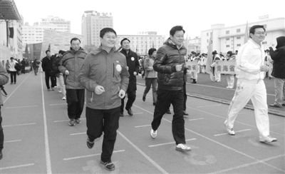 昨天,第六届全国亿万学生阳光体育运动冬季长跑启动仪式在北京市地坛体育场举行。教育部副部长杜占元、北京市副市长洪峰等亲自率队领跑,由此拉开了全国大中小学校冬季长跑活动的序幕。今年的冬季长跑中,首次引入保卫钓鱼岛的概念,根据学生年级不同设定不同的距离目标。
