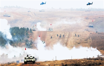 不到2分钟,强击航空兵群、武装直升机群、装甲突击群同时出击,空地一体火力交叉融合,“敌”阵地目标悉数被毁。