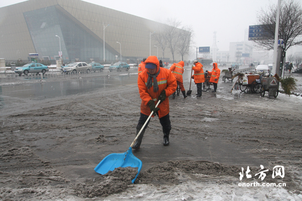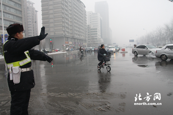 天津北方网讯:从12月13日晚到14日清晨,津城普降中到大雪,津城交警严阵以待,凌晨5:30开始,全员出动疏导交通,并配合环卫工人清理路面积,保障路面畅通。