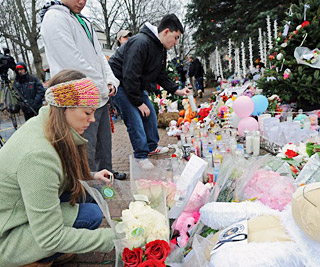 ●16日起,美国康涅狄格为纽敦桑迪胡克小学枪击案遇害者展开大规模的悼念活动,桑迪胡克小学校门口堆满了各种纪念品和蜡烛,寄托人们的沉痛哀思。枪击案导致27人被杀,其中包括20名儿童,枪手自杀身亡。(上图)