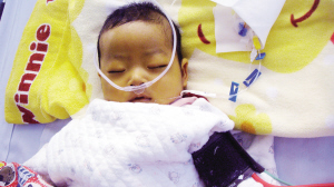 昨日,记者再次来到天津市第一中心医院,小馨莹已经被转入重症监护病房内,插着氧气管,陷入昏迷。原来,孩子在凌晨突然高烧不退,一度烧到了39.3℃,呼吸急促。医生怀疑是肺部感染,立即施救,随后将她转入重症监护病房。所幸昨天白天她已经退烧,但仍然在昏迷中。
