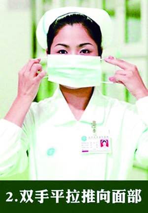 4、右手按住口罩,左手将护绳绕向耳根部。
