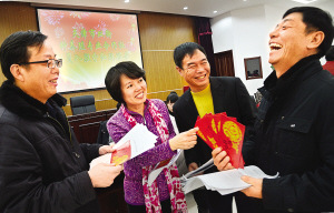 8:30,随着村党委副书记刘春东宣布分红开始,村民们按顺序签字领取到合作社兑现的红利和补贴。按照分配方案,这次分红全村1047个入股村民每人半年获得红利5000元。红利是以银行卡的形式装在大红纸袋中发给村民的。纸袋上“金蛇纳福”四个烫金大字传递出幸福的气息。